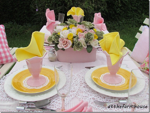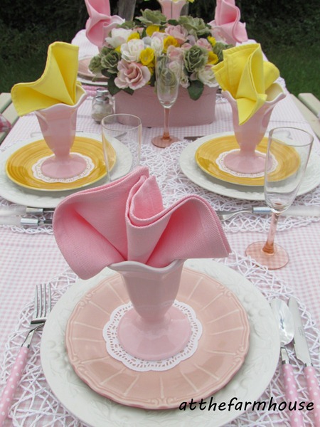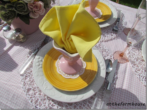 I have used my pink polka dot flatware (I love that stuff!) and also a white set. Pink napkins I have had for a while but the yellow ones I found thrifting last year.