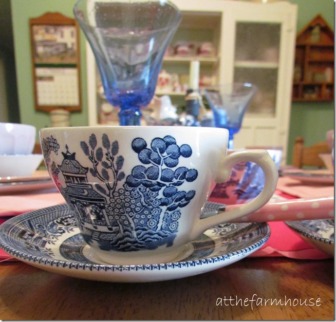 Did you ever sit with your Nana and share a cup of tea in a Blue Willow teacup? I know I did and just looking at it brings back many memories.  This week’s table shows that the old Blue Willow is still as lovely today. I have a whole dresser (here) of gorgeous blue and white china. I say I’m not a ‘blue’ person but a whole dresser filled with blue and white china just catches my eye.