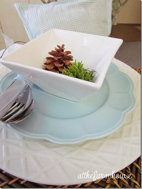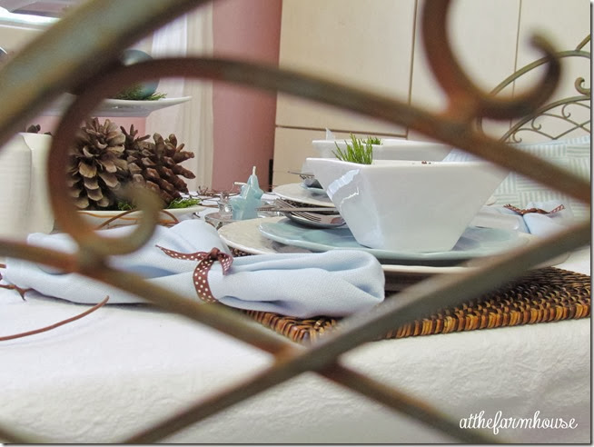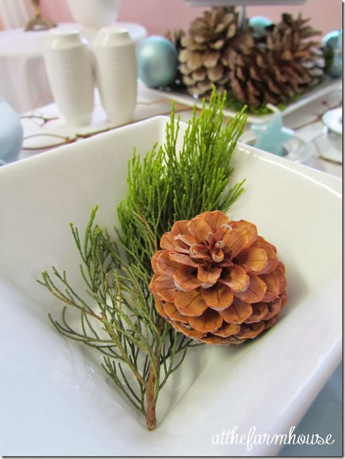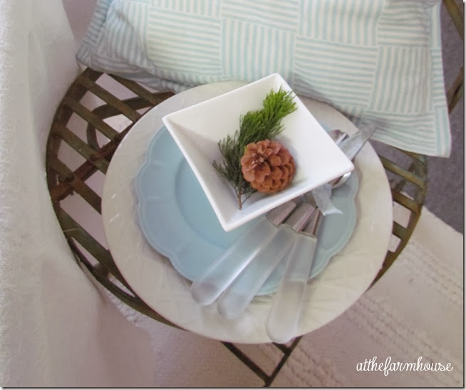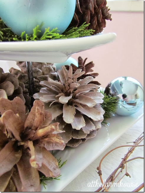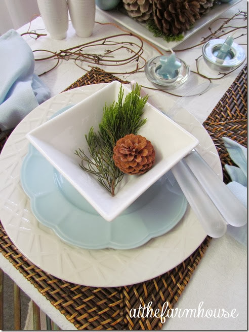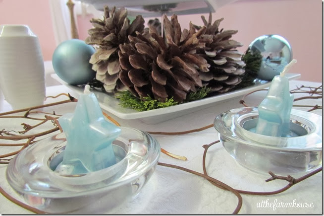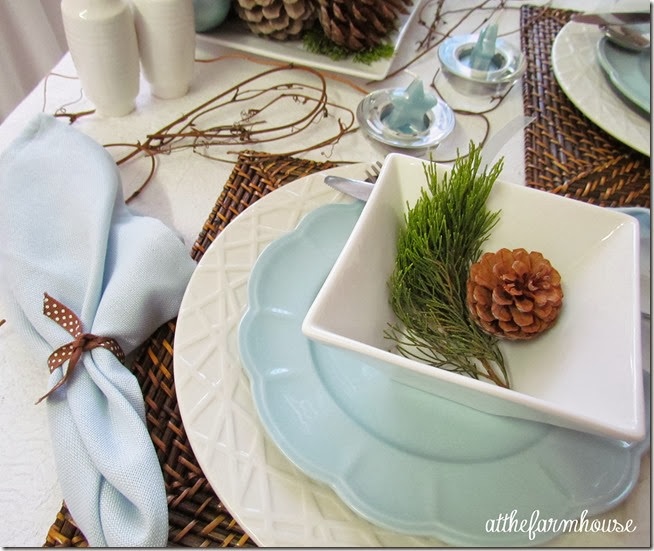 I love a simple table. The pinecones look so beautiful with the blue. I saw the instructions for bleaching pinecones and look forward to trying it. A simple, quiet look for Christmas is always appealing. Happy Thanksgiving!