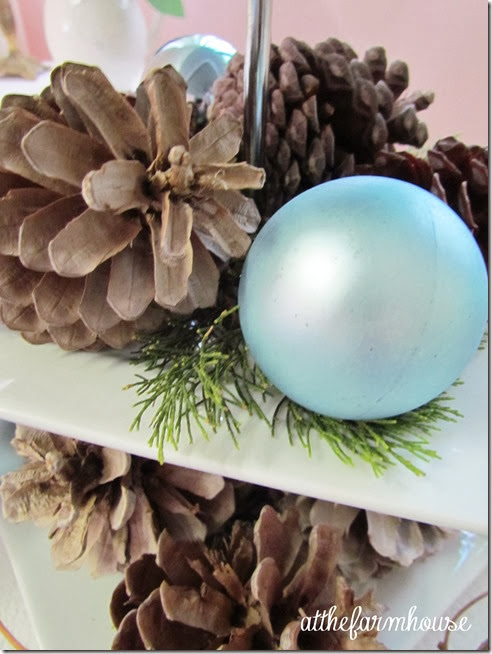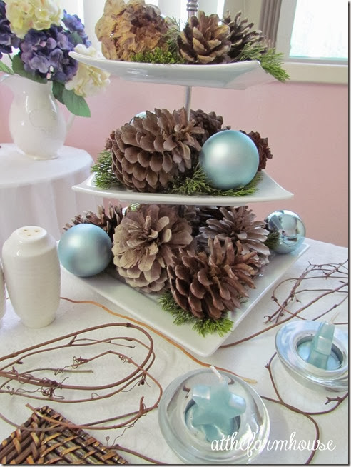 I love the icy blue feeling with that soft blue! So pretty and I also like how you used the pinecones on the 3 tierd serving tray! Great shots of your table, I never know quite how to get those good shots! Stopping by from Let's Dish!